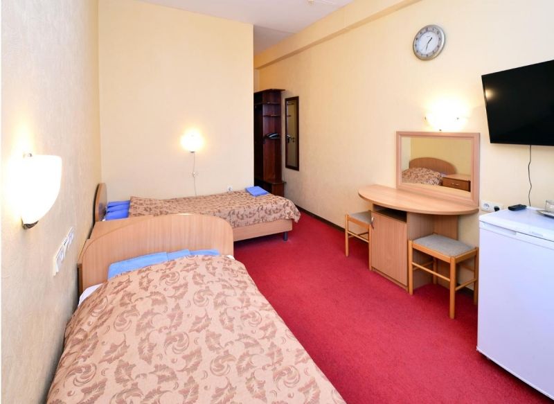 Оборудование номера: две односпальные кровати, прикроватные тумбочки, шкаф для одежды, стол со стульями, телевизор, холодильник, электрочайник, телефон