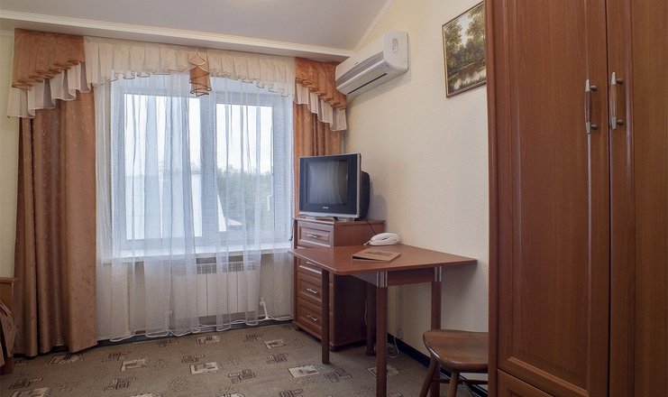 В номере: кровать двуспальная, прикроватные тумбочки, стол, стул, шкаф, кондиционер, набор посуды, телевизор, телефон, холодильник
