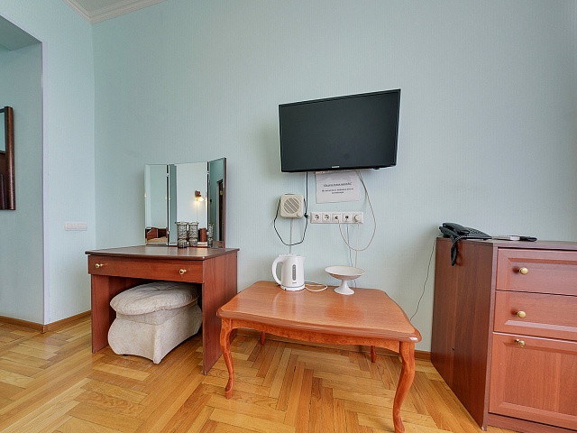 В номере: кровать полутороспальная, комплект - кресло (раскладное), пуфик, тумба прикроватная, журнальный столик, стол туалетный с зеркалом, встроенный шкаф, тумба TV, телевизор, холодильник, кондиционер, телефон