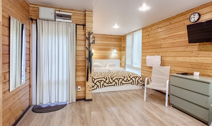 В номере: вешалка, диван раскладной, кровать двуспальная, кровать двухъярусная, кухонная мебель, прикроватные тумбочки, стол, стулья, тумба под телевизор, шкаф, микроволновая печь, плита электрическая, телевизор, холодильник, чайный набор посуды, электрочайник