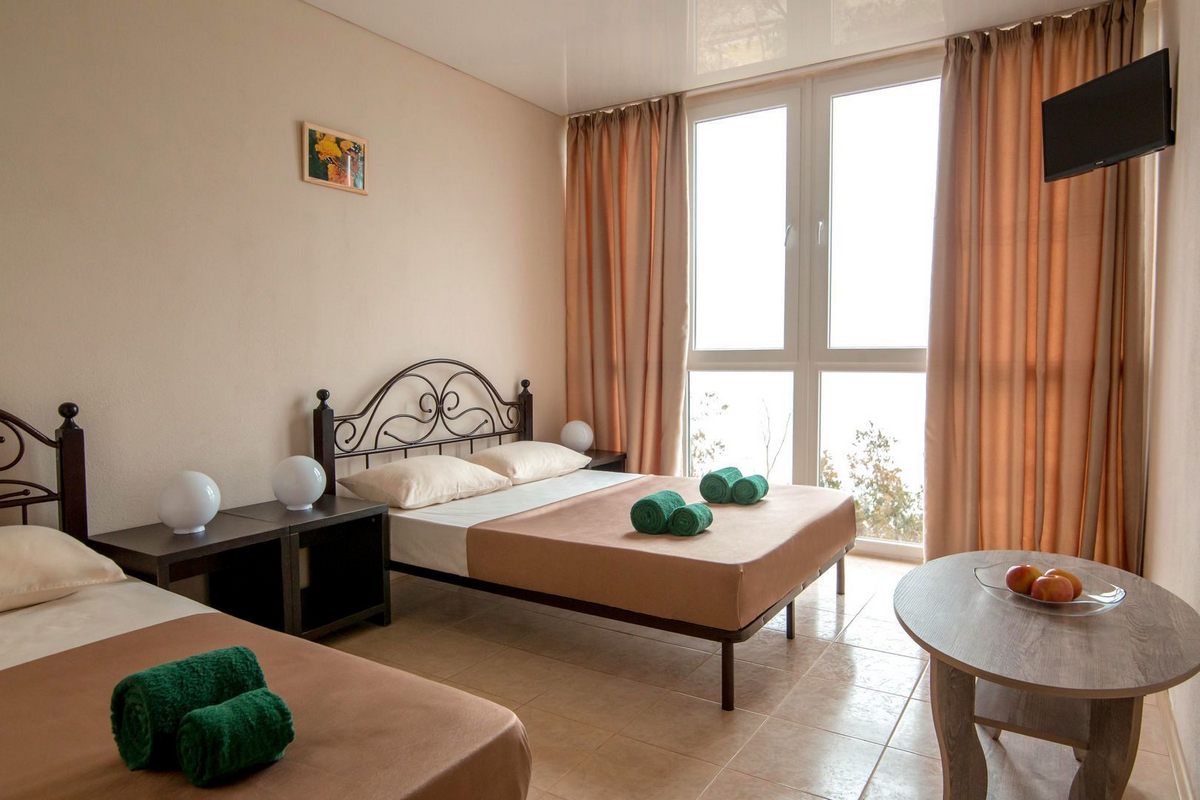 В номере: двуспальная кровать и одна односпальная либо три односпальные кровати, прикроватные тумбы, стол, шкаф для одежды, кондиционер, ЖК телевизор, Wi-Fi, холодильник, электрочайник