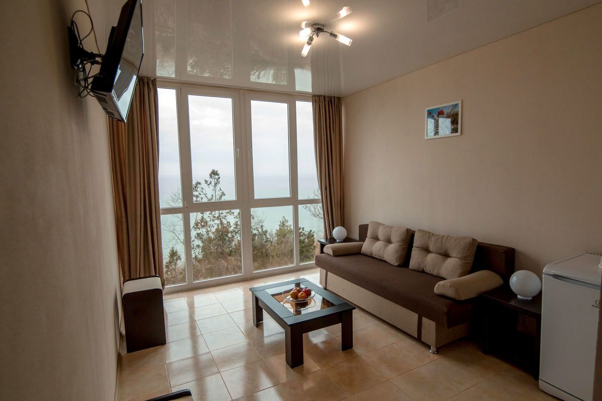 В номере: две комнаты: спальня и гостиная, двуспальная кровать или две односпальные, прикроватные тумбы, стол, шкаф для одежды, мягкая мебель, журнальный столик, кондиционер, ЖК телевизор, Wi-Fi, холодильник, электрочайник
