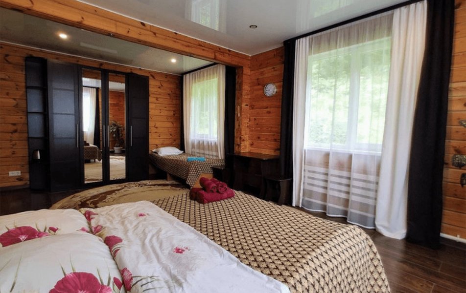 В номере: вешалка, зеркало, кровать двуспальная, кровать односпальная, прикроватные тумбочки, стол, стулья, шкаф, микроволновая печь, набор посуды, телевизор ЖК: смарт, холодильник, электрочайник